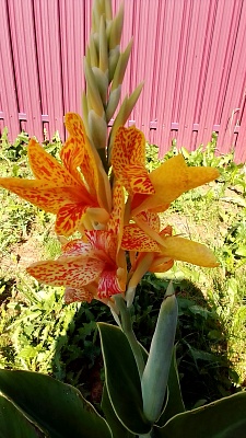 Канна Пикассо - многолетнее травянистое растение с прямыми стеблями и мясистыми клубневидными корневищами высотой 90см. Листья крупные, мощные, зеленые. Соцветие - кисть, которая начинает цвести с нижнего цветка, потом постепенно поднимается  вверх над кустом. Цветки желтые с красным крапом диаметром до 12см. Канны декоративно выглядят в больших групповых посадках. На клумбах их располагают в центре. Хороши также канны летом на балконах и террасах.